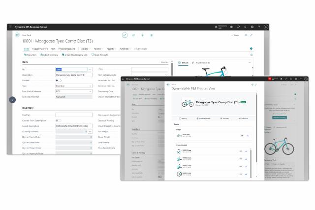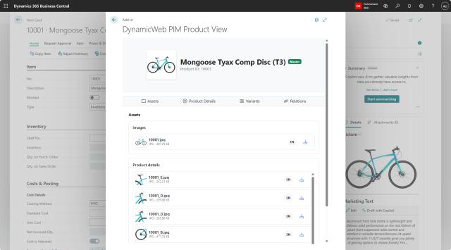 From the Business Central item card, access a PIM view with enriched product details, related items, and digital assets not otherwise available in Business Central.